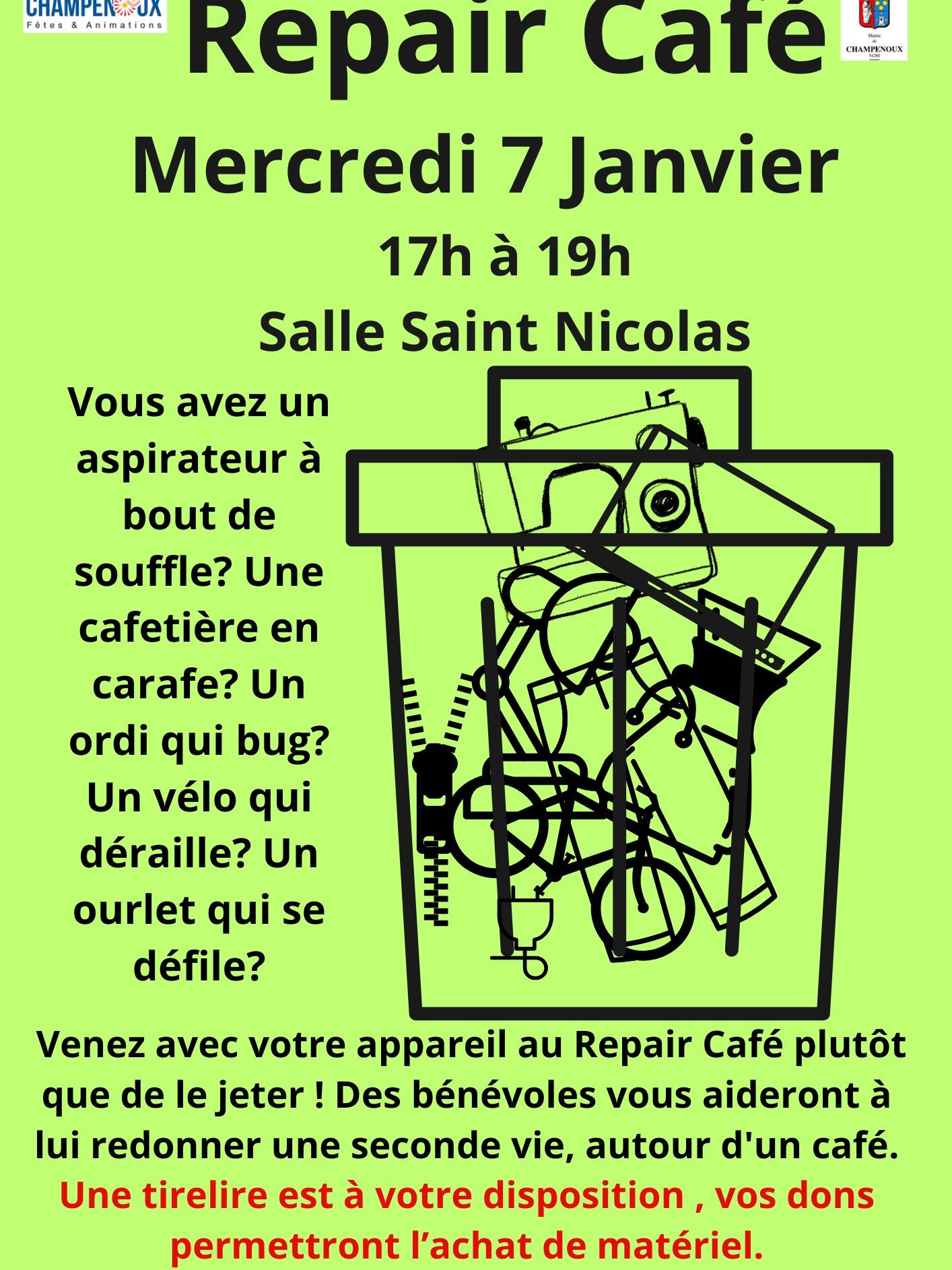 - Description : Votre couteau à huitres est cassé, la bretelle de la robe de Nouvel An est déchirée, votre nouvel aspirateur tombe déjà en panne, l’appareil à raclette fait du fromage râpé, votre outil de jardin est en jachère….le père Noel a besoin d’un café pour se remettre de la fatigue….alors vous êtes au bon endroit pour tout réparer!Le Repair’ café 2026 vous attend!