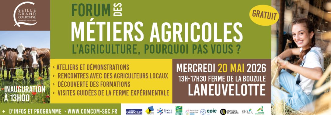 Vous avez envie de découvrir un secteur qui recrute et qui a du sens ? Le Forum des métiers de l’Agriculture vous ouvre ses portes pour une immersion au cœur des savoir-faire du territoire de Seille et Grand Couronné, sur le site emblématique de la Bouzule – ENSAIA à Laneuvelotte.