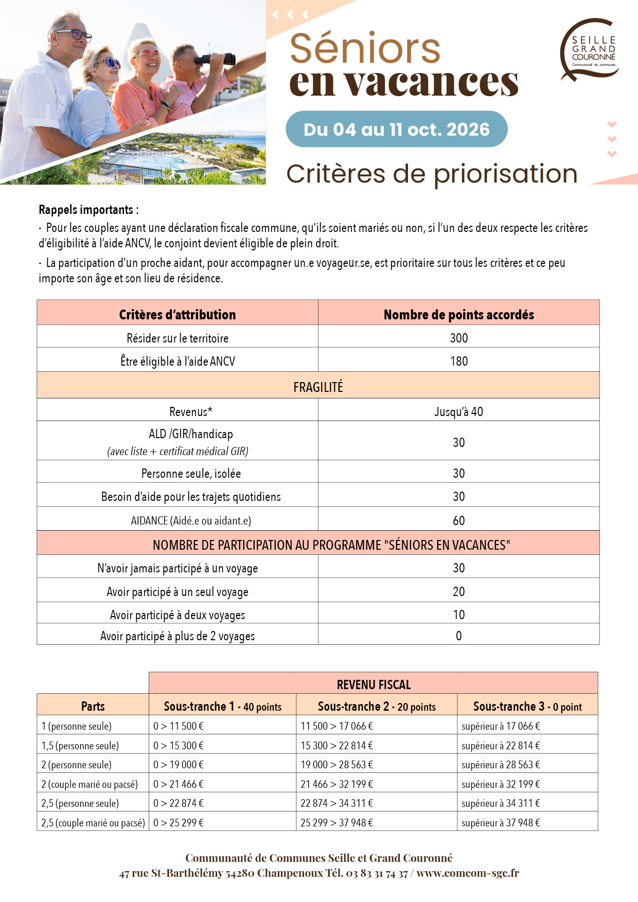 Bulletin d’inscription Seniors en vacances 2026 – 7,63 MoLes places étant limitées à 110 personnes en 2026, en cas d’inscription en nombre trop élevé, l’attribution se fera selon des critères et des points définis, à retrouver ci-dessous. Cette liste vous est communiquée pour garantir la transparence de nos procédures.
